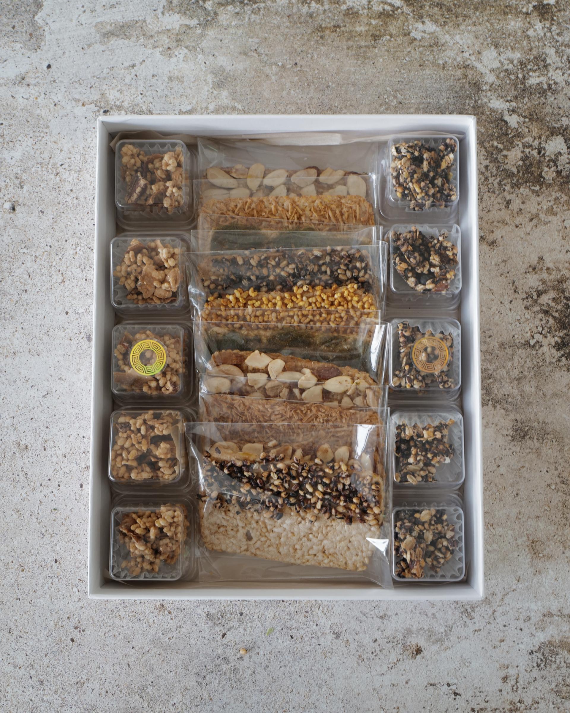 5가지맛 누룽지 크리스피 + 2가지맛 쌀 강정으로 구성된 실속 한과 상자입니다.
